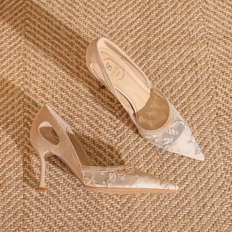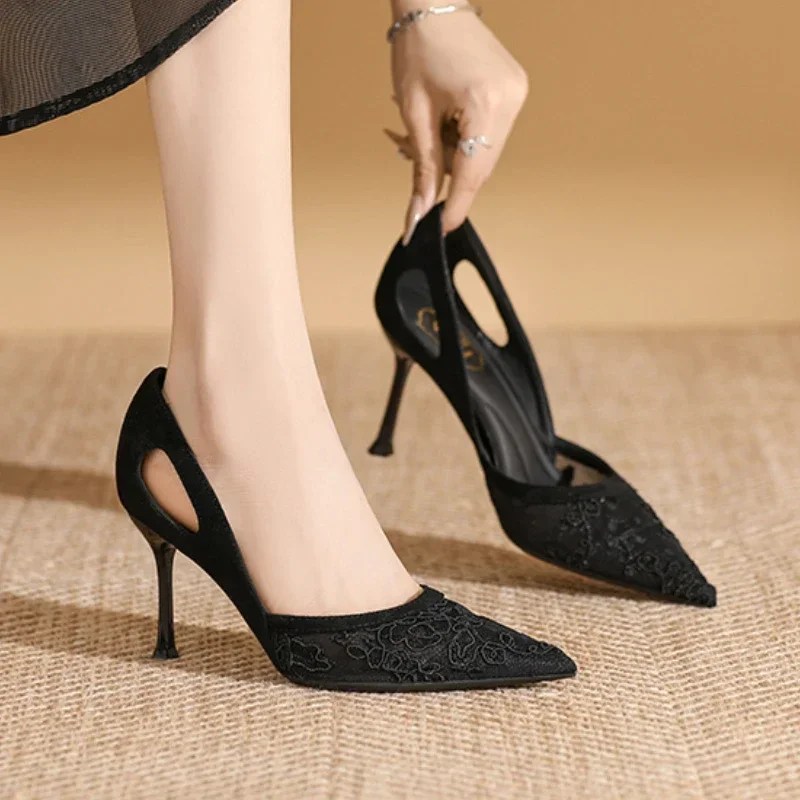 Elegant Lace Mesh Brand High Heels Women Fashion Pointy Toe Thin Heel Designer Shoes Sexy Party Dress Shoes Zapatos Para Mujer