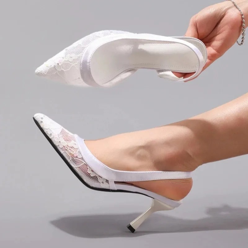 Elegant Lace Mesh High Heeled Sandals Women Luxury Bling Back Strap Brand Designer Shoes Fashion Pointy Toe Party Dress Shoes