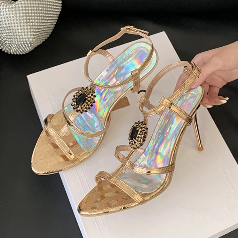 Liyke 2025 New Fashion Gem Strap Ankle Buckle Women Sandals Summer Open Toe Gold High Heels Wedding Prom Shoes Zapatos Mujer