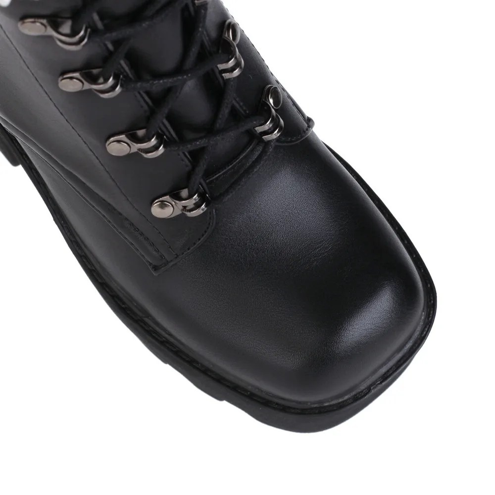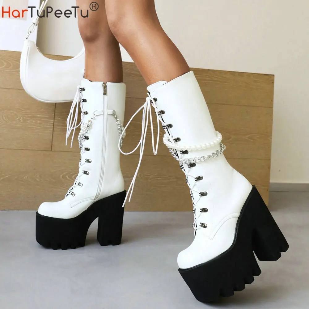Platform Motorcycle Boots Mid-Calf Women Autumn Winter Punk Style Bead Chain Decorate Chunky Heel PU Leather Wedges Shoes