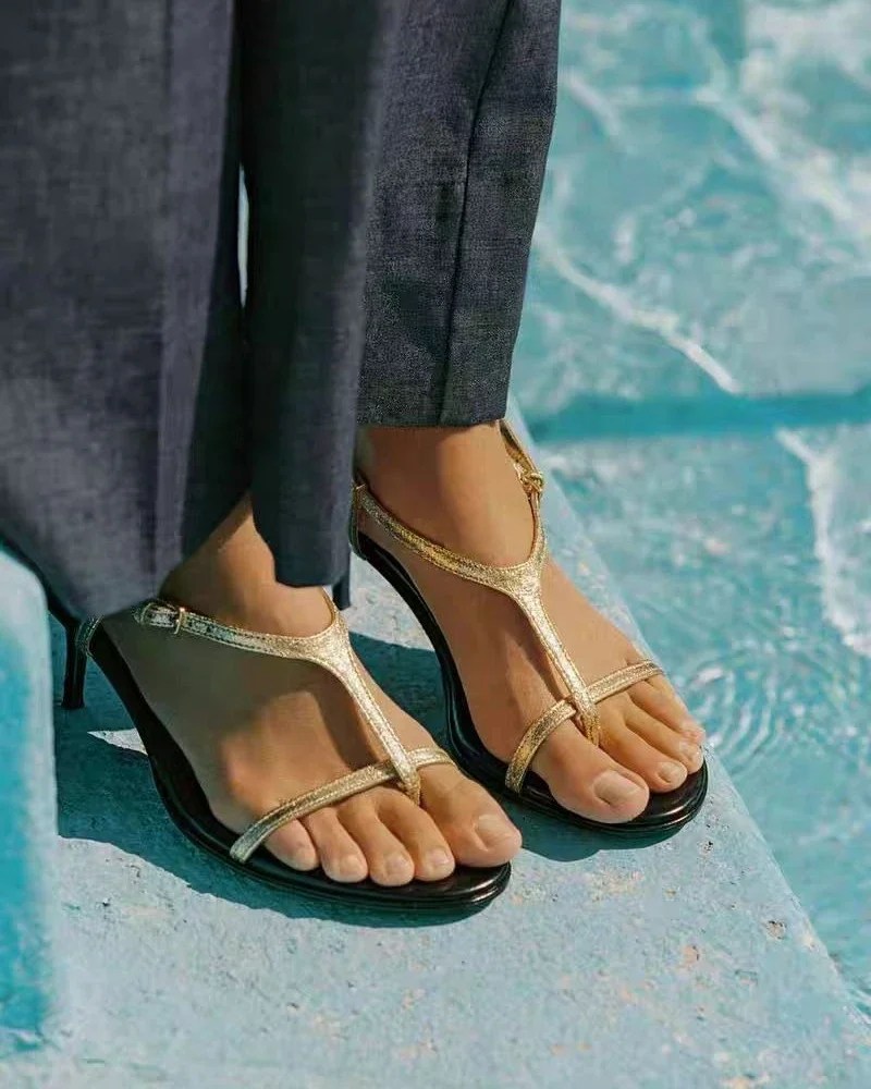 Summer Sexy Gold Narrow Band High Heeled Sandals Women Fashion Clip Toe Buckle Brand Designer Flip Flops Elegant Ladies Sandals